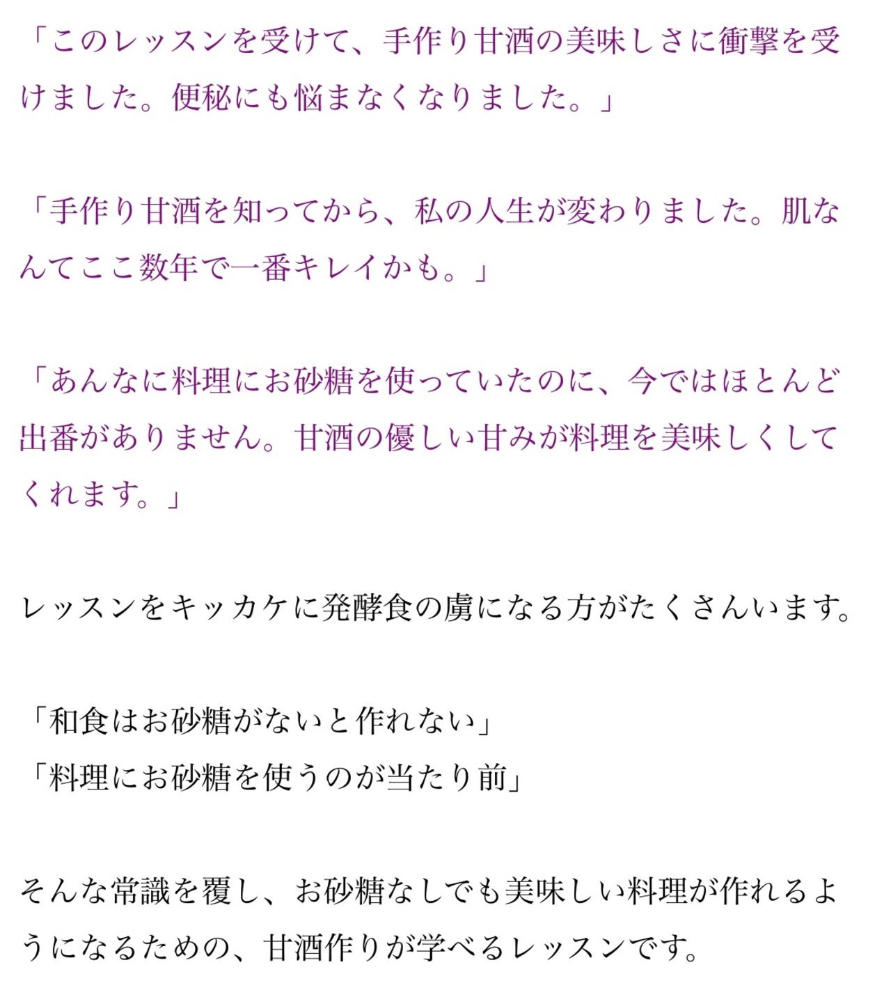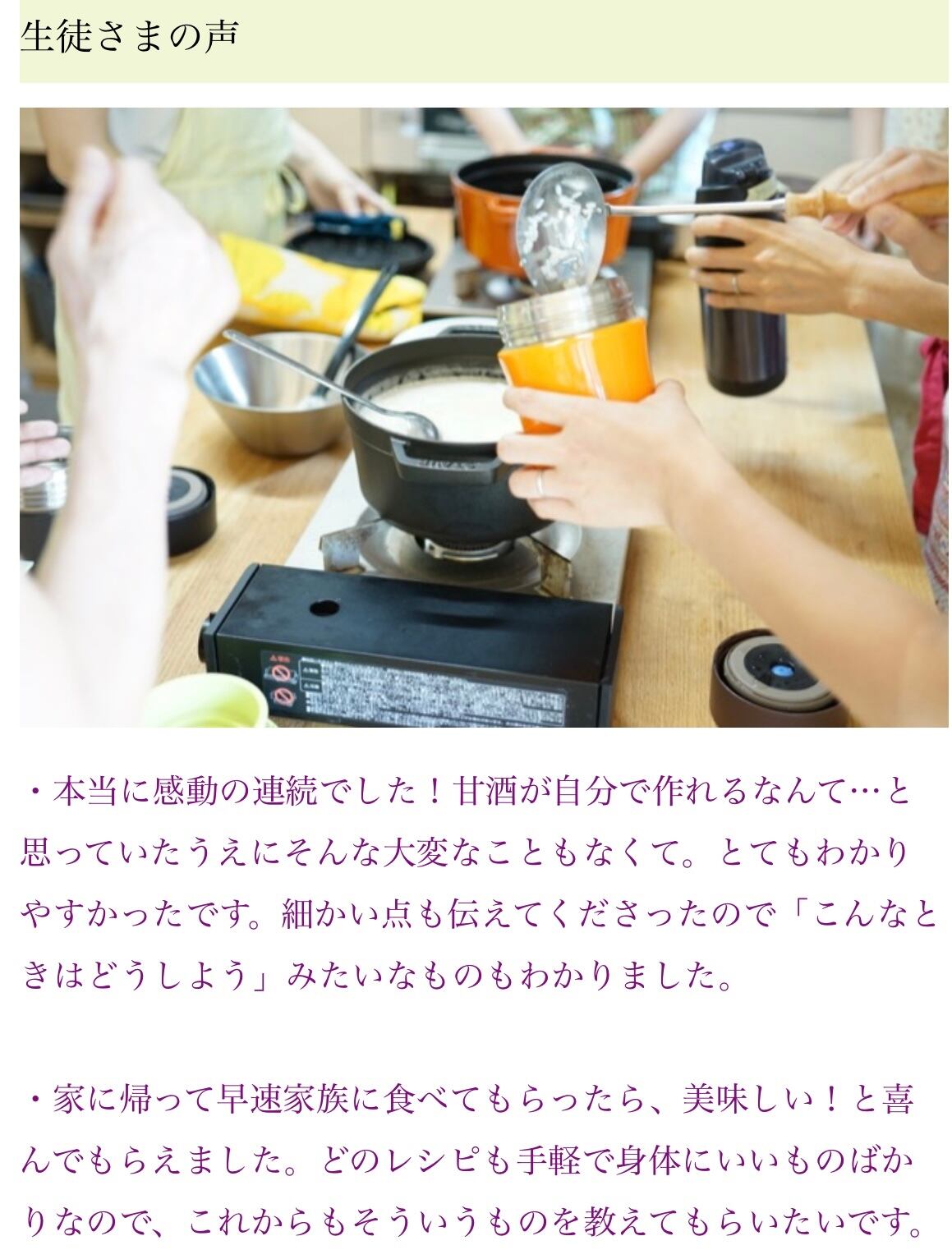 「この体験レッスンを受けて、手作り甘酒の美味しさに衝撃を受けました。便秘にも悩まなくなりました。」